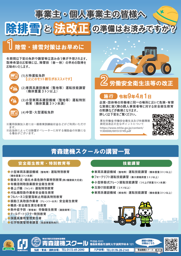 除排雪作業に使われる大特免許と車両系建設機械(整地等)運転技能講習(機体重量3トン以上)、小型車両系建設機械(整地等)運転特別教育(機体重量3トン未満)、排雪用のダンプを運転するための中型・大型運転免許などは冬期間の混雑が予想されます。また、資格取得には時間もかかりますので、春から秋までに取得されることをお勧めいたします。